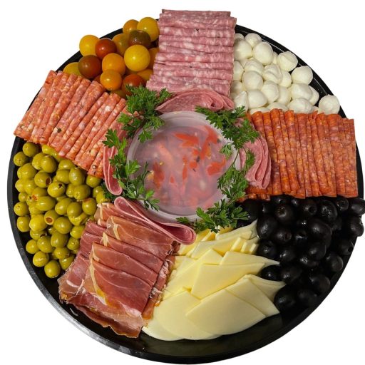 Prosciutto, sweet & hot soppressetta, pepperoni, roasted red peppers, green olives, cherry tomatoes, fresh mozzarella & provolone cheese.