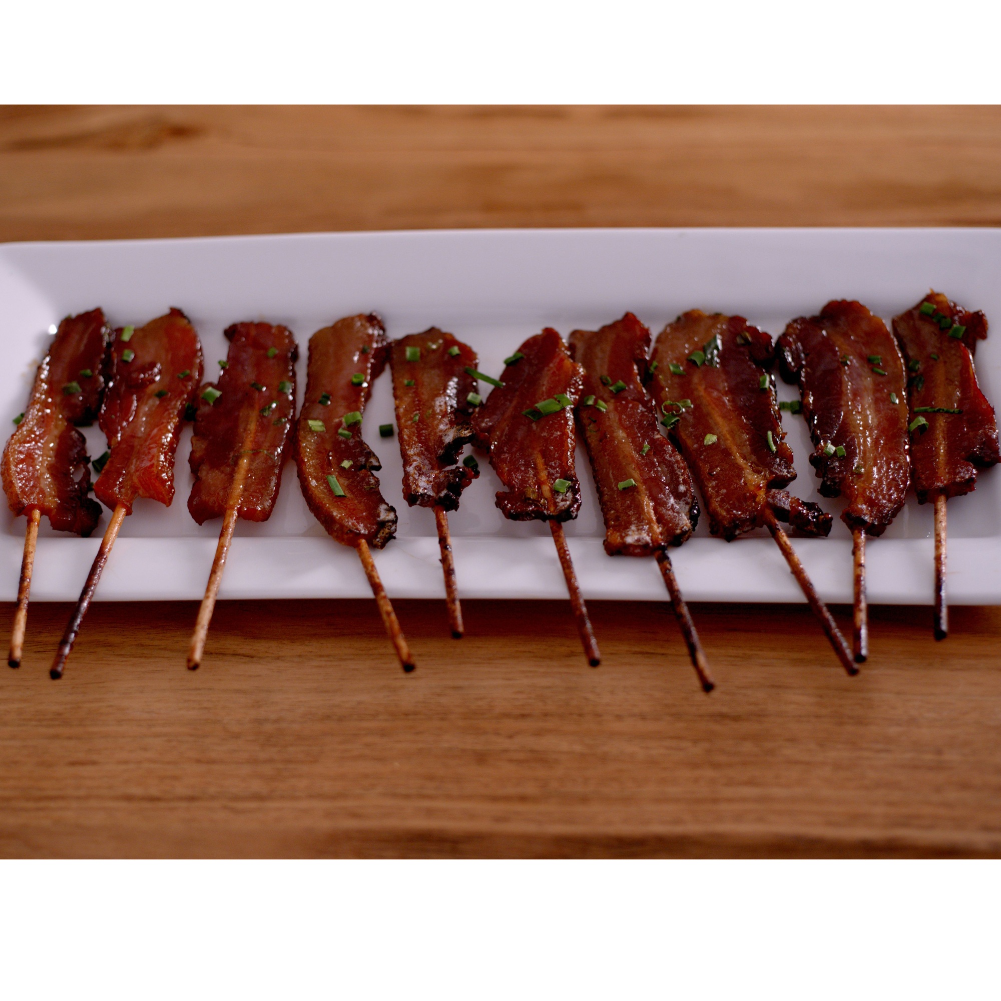 Skewers of thick cut Barth's bacon seasoned with brown sugar and maple syrup. Ready to cook.