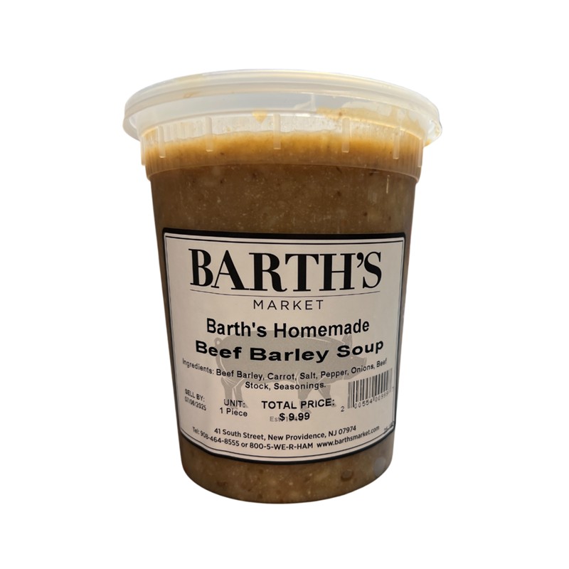 Our homemade beef barley soup is sold by the quart.