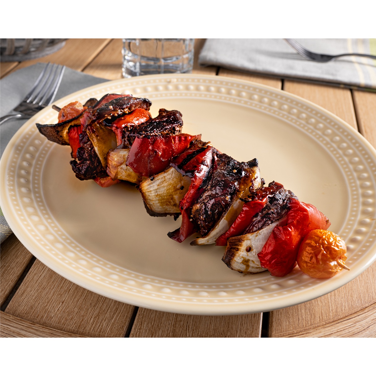 12 Skewers of grilled steak, onions, peppers, and cherry tomatoes seasoned in a peppercorn marinade. Serves 10-12.