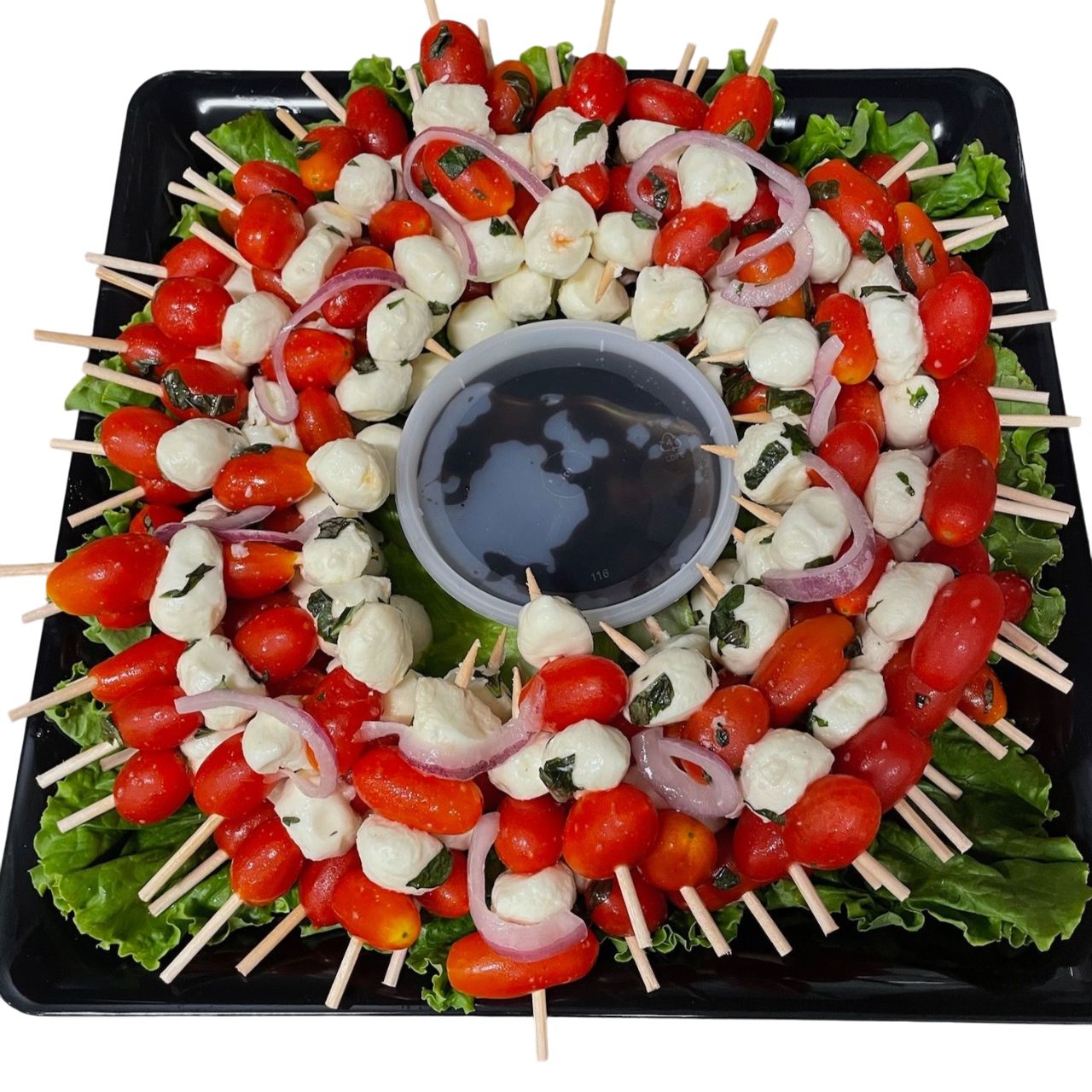 Tomato & mozzarella topped w/ basil & balsamic drizzle. Choose between skewers of cherry tomatoes and ciliegine mozzarella or a platter of sliced tomato & mozzarella. Please indicate which type of Large platter serves 20-30.