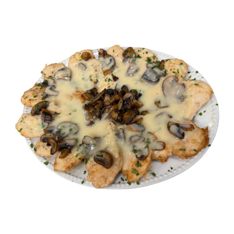 Half tray of sauteed chicken in a delicate sauce of champagne, butter, and mushrooms. Sauce contains gluten.