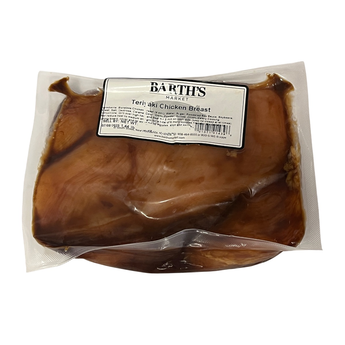 Boneless chicken in teriyaki marinade, vacuum-sealed for freshness.