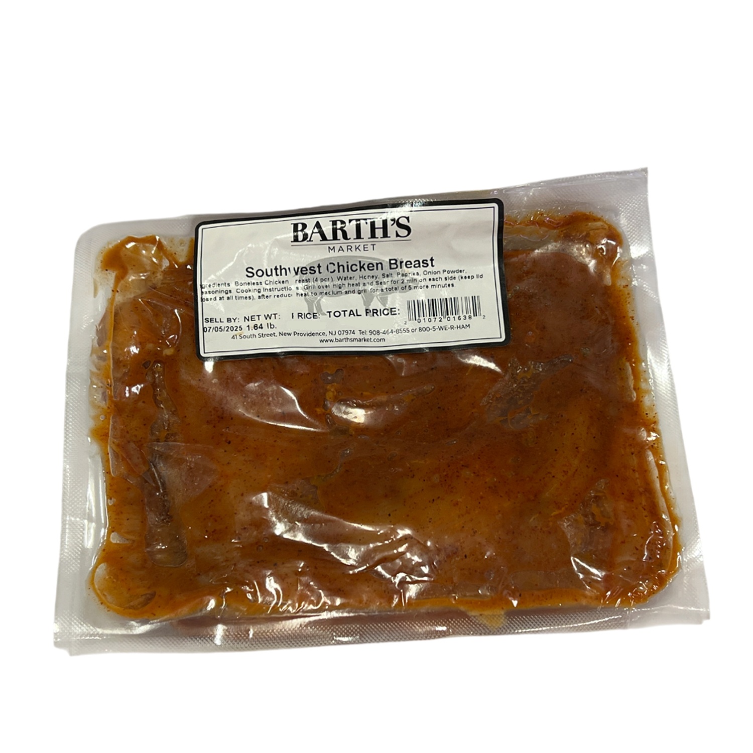 Boneless chicken breast in southwestern marinade and vacuum sealed for freshness.