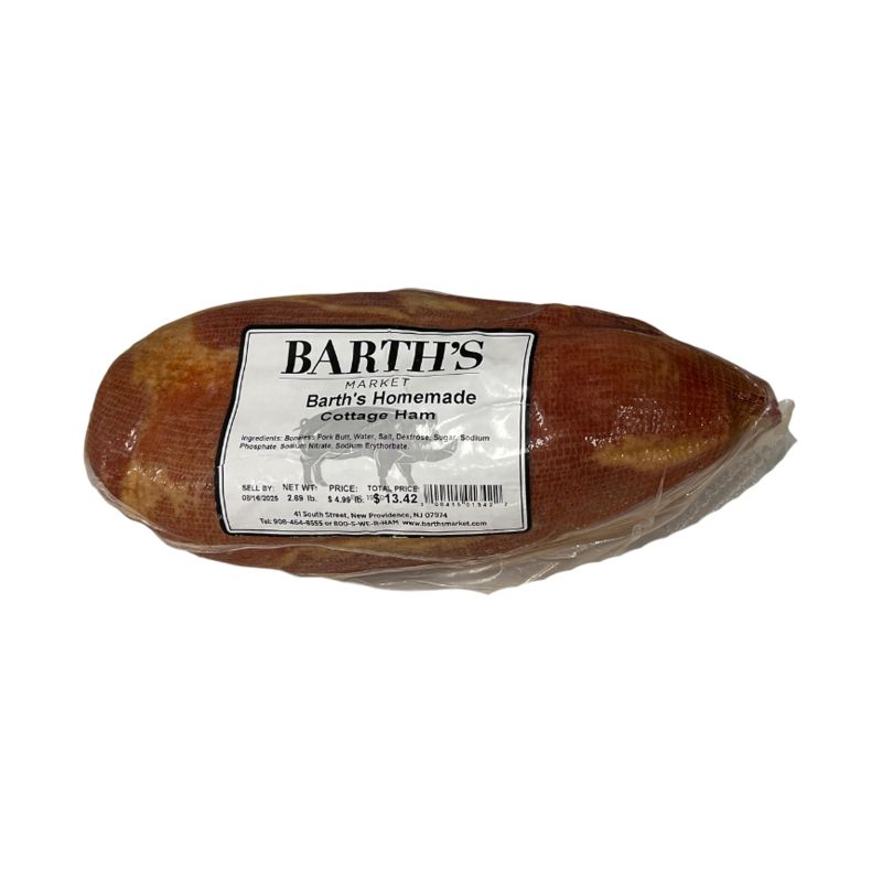 Barth's homemade Cottage Ham is made of brined and smoked boneless pork shoulder. This ham is wrapped in a netting which must be removed prior to serving. Our cottage hams are vacuum sealed for freshness.