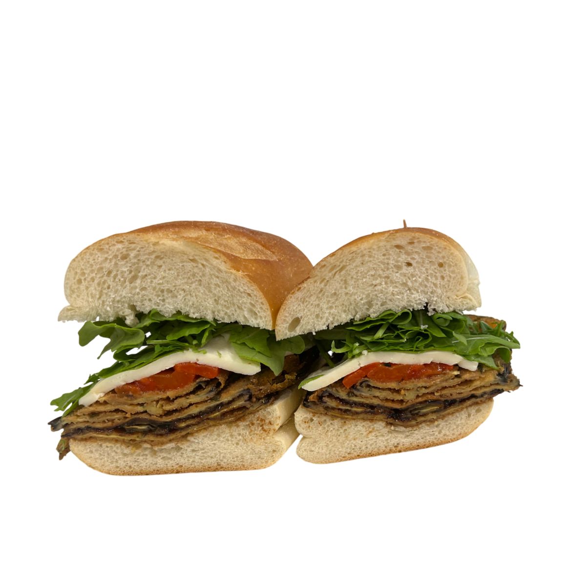 Breaded eggplant, mozzarella, roasted peppers, arugula, and balsamic on Italian sub roll.