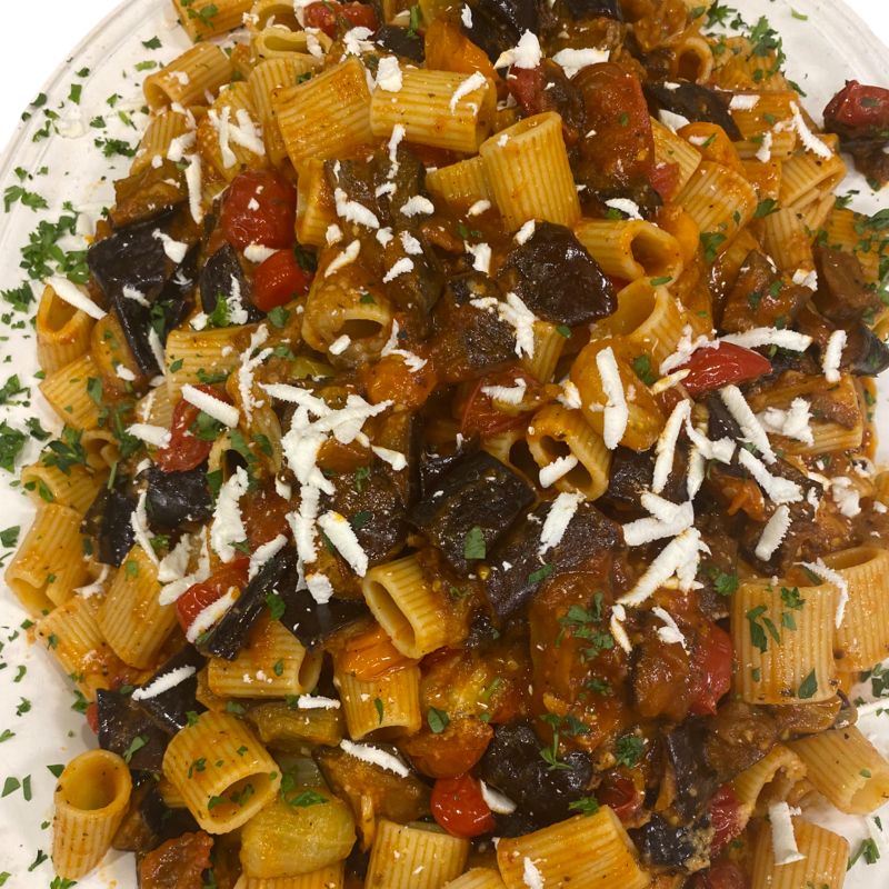 Half tray of pasta with eggplant, homemade marinara & ricotta salata.