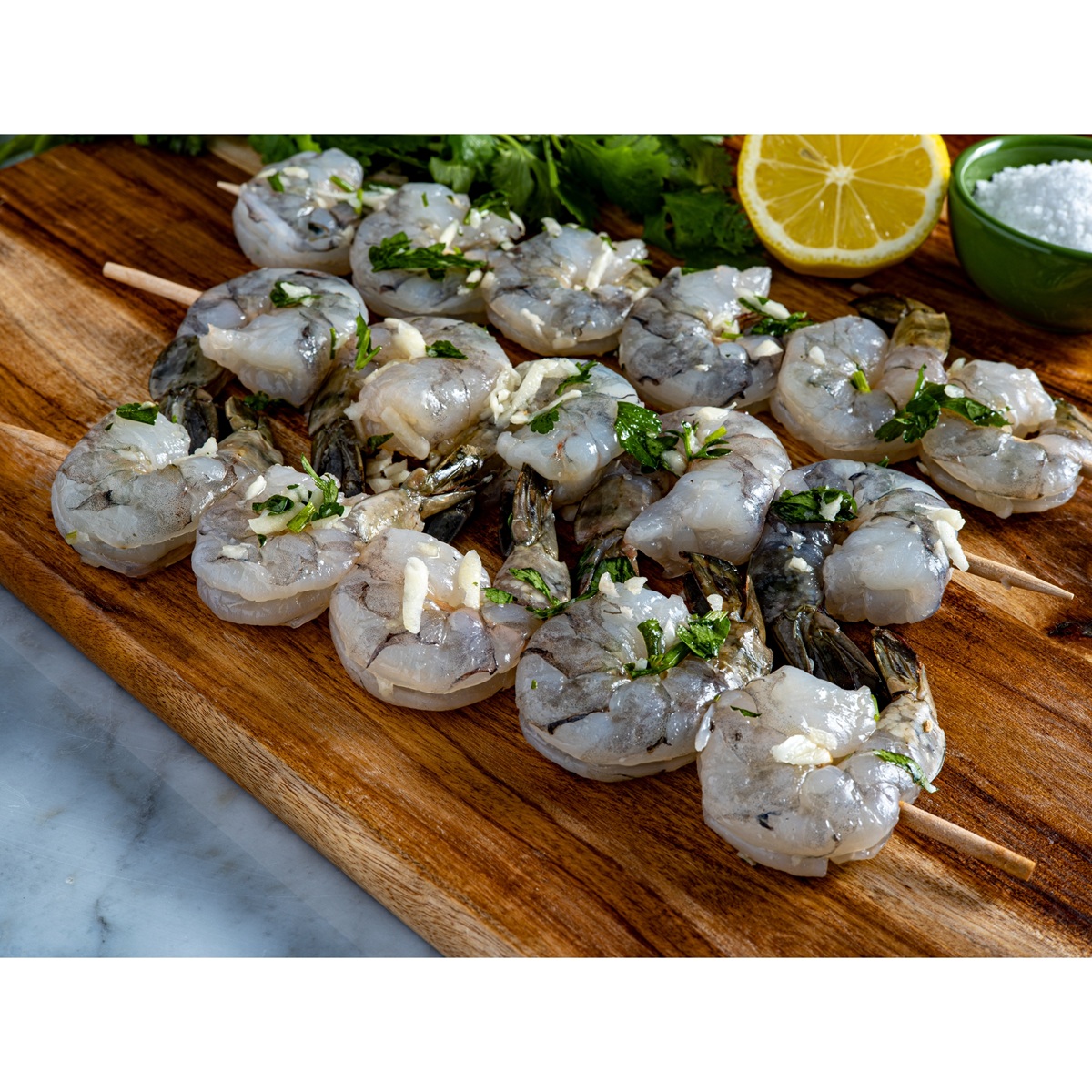 Barth's marinated shrimp kebabs. Shrimp size is 16-20 per pound.