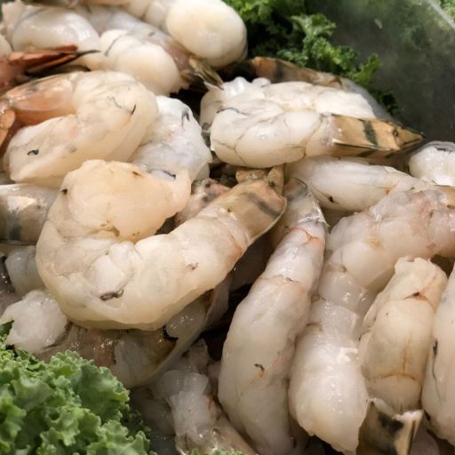 60 pieces of cooked shrimp, lemon, and Barth's cocktail sauce on a platter.