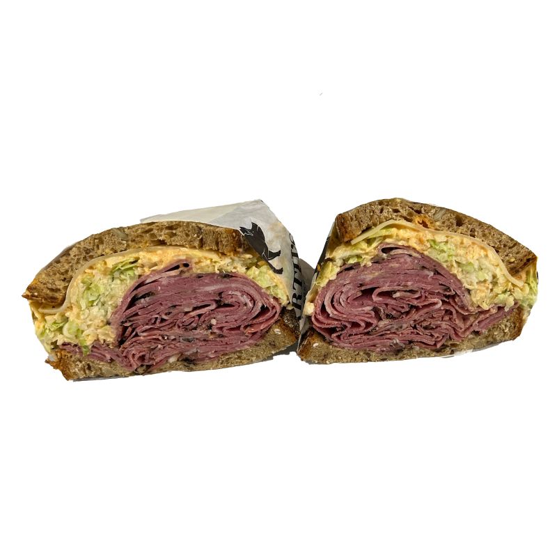 Pastrami, colesalw, Swiss cheese & Russian dressing on multi-grain bread.