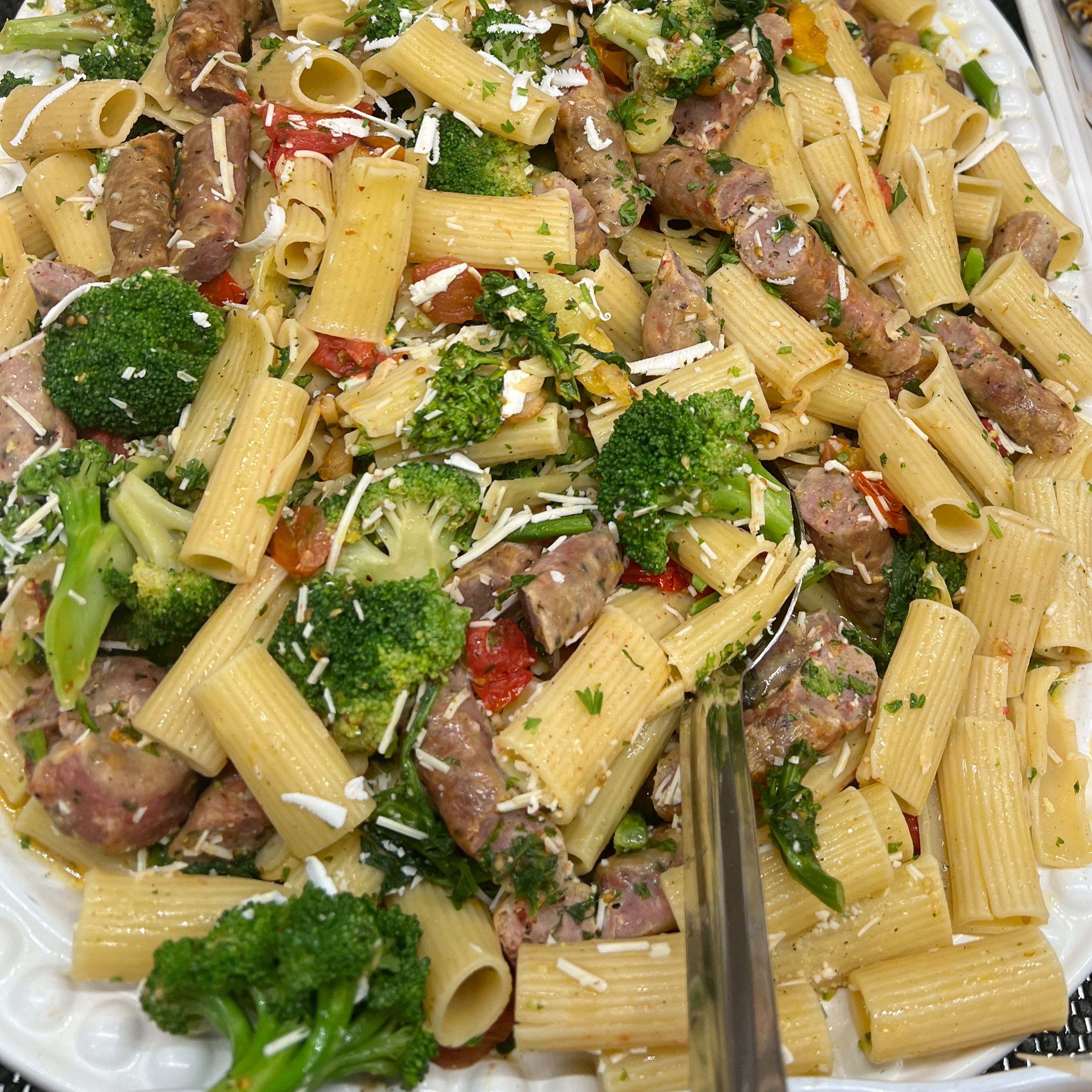 Half tray of pasta with ground sausage, broccoli rabe, sun-dried tomatoes, garlic & oil. Serves 10-12.