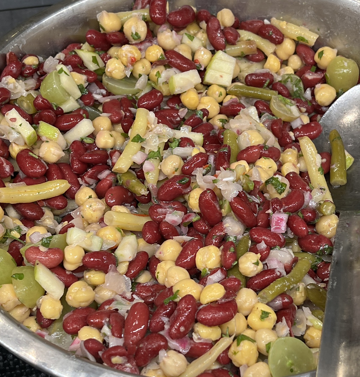 Three bean salad with green beans, kidney beans, chick peaks, onions and grapes. Sold in a black bowl that serves 10-12.