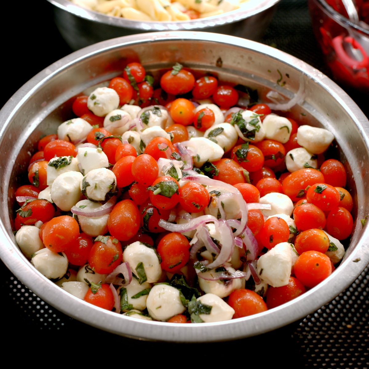 Try this customer favorite of cherry tomatoes, ciliegine mozzarella, and basil in a light vinagrette.