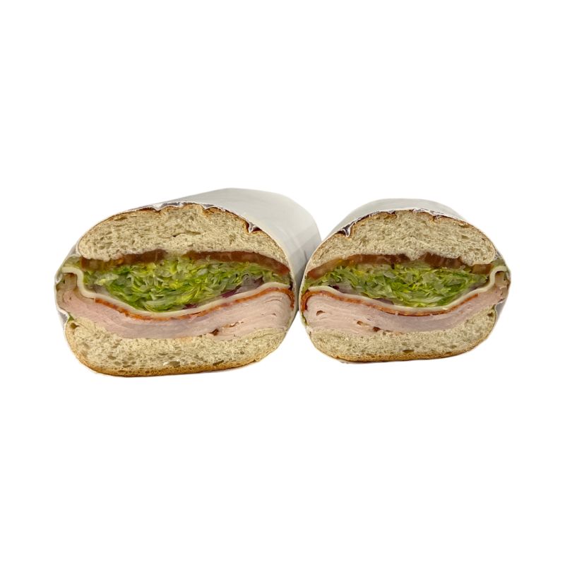 Turkey breast, pepperoni, provolone, red onion, lettuce, tomato, salt & pepper, oregano, oil & vinegar.