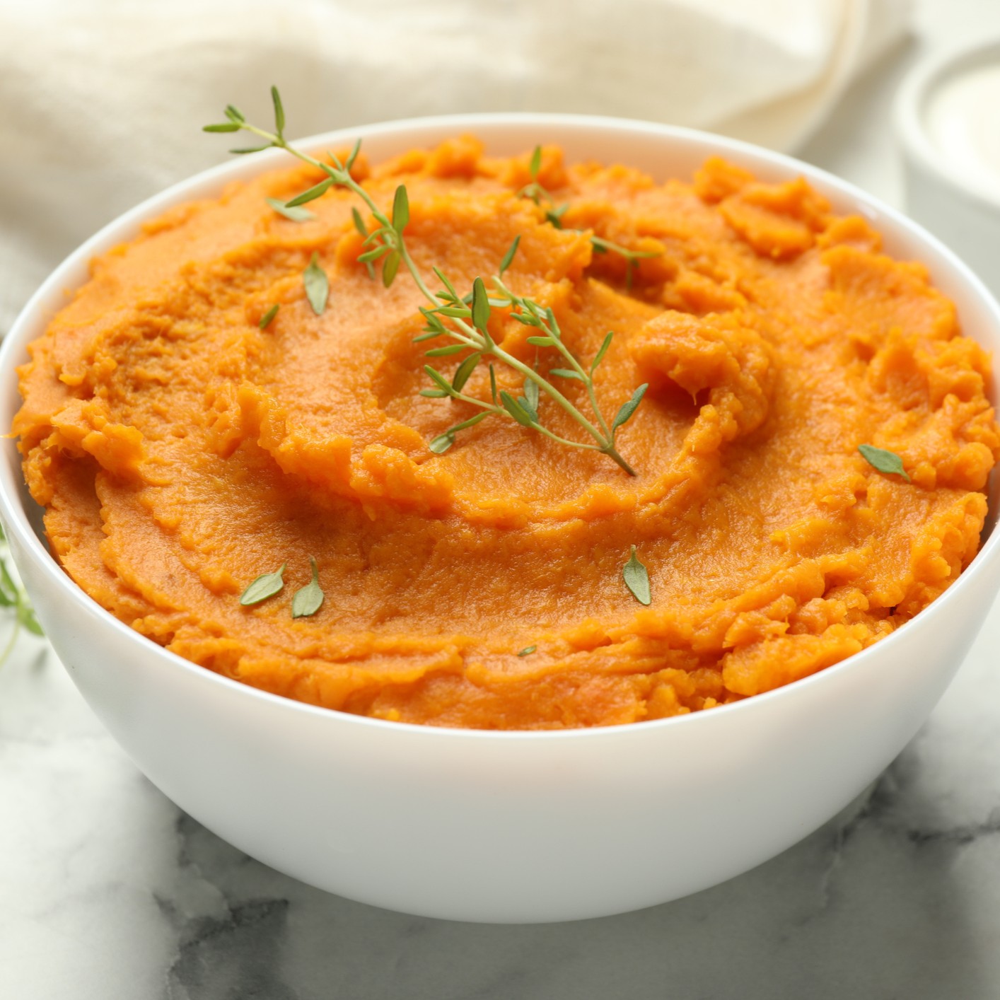 Sweet potatoes whipped with heavy cream, brown sugar, and butter. Serves 10-12 as a side dish.